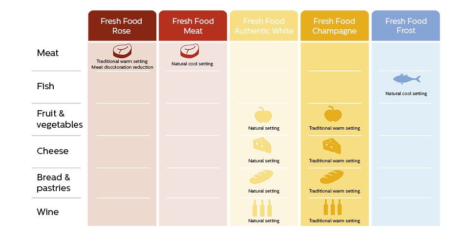 Các loại thực phẩm tươi sống như thịt, cá, rau xanh, trái cây, hoa quả . . . sẽ trông hấp dẫn và bắt mắt hơn hơn khi được chiếu sáng dưới bóng đèn LED với nhiệt độ màu phù hợp (Bảng thảm khảo bên dưới). Đèn LED giúp hiển thị sản phẩm trong điều kiện ánh sáng tốt nhất, mang lại màu sắc tươi sáng và giúp khách hàng muốn thưởng thức ngay. Ánh sáng phù hợp không chỉ thu hút sự chú ý, mua hàng của khách hàng mà còn giúp tổng thể trưng bày của cửa hàng với tầm nhìn rõ ràng và tốt nhất. Công nghệ đèn LED cũng giúp tiết kiệm năng lượng, thân thiện môi trường và mang lại hiệu quả cao.